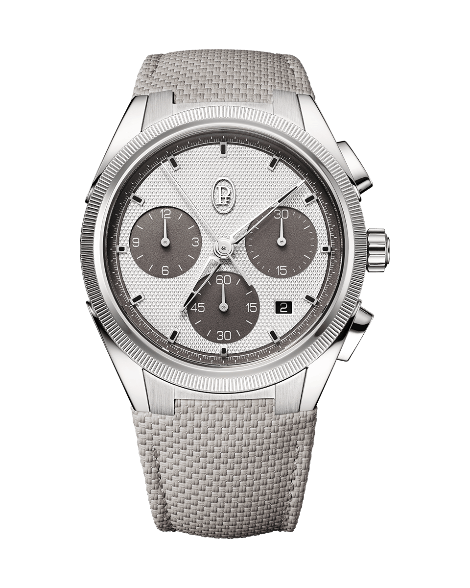 TONDA PF Sport Kronograf 42 mm çapındadır ve sportif karakterini vurgulayan cesur bir ışık ve yansıma etkileşimi yaratan belirgin bir tırtıklı çerçeveye sahiptir. Kadran, elle guilloche yapılmış 'üçgen çivi' deseniyle dekore edilmiştir. Uygulanan saat işaretleri siyah SuperLuminova ile kaplanmıştır.